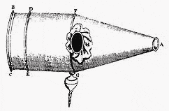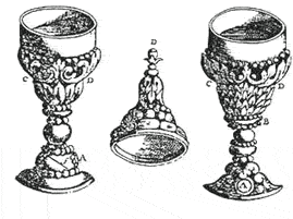 O projeto taça camera obscura (esquerda) de Pierre Herigone (1642), e ilustrado por Johannes Zahn em seu "Oculus Artificialis Teledioptricus Sive Telescopium '(1685). Um dispositivo engenhoso, na verdade, se você queria para espionar os outros, enquanto desfruta de sua companhia com uma bebida. O espelho (f) estava em um ângulo de 45 graus na base com uma abertura estilizada para a lente (A), de modo a não levantar suspeitas. A taça tinha um copo (CD) feitas de vidro onde a imagem podia ser visto. A tampa (centro) tinha uma lente de aumento (D), na parte superior. Esta foi provavelmente uma novidade com pouco significado prático. Se quer saber o que os outros pensariam de um usuário com o olho tão perto do copo ou tampa.