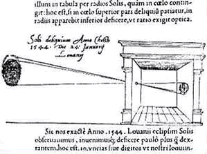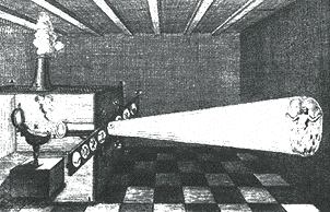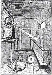 3 O interior mostrado (direita) (mais uma vez a partir de 'Oculus') nesta gravura pode ser muito provável que o quarto ilustrado na figura da esquerda para cima [2] (ou um semelhante). Esta câmara escura mostra um telescópio alojados dentro de uma bola scioptric (montado na parede esquerda superior), mas o mais importante, observe a direção-rod ligado imediatamente abaixo do telescópio. A haste foi utilizado para seguir o movimento do sol durante todo o dia de rastreamento que é, assim, o movimento. Na parede da direita pode ser visto um banco de apoio da tela, um longo parafuso e suporte para ajuste. Uma imagem extremamente brilhante e claramente focado do sol ou paisagem pode ser visto através deste método. No chão, podemos ver a bola scioptric, telescópio, ajustando suporte e lente. Johannes Zahn foi um visionário que era, obviamente, à frente de seu tempo quando se considera as muitas idéias, sugestões, invenções e várias câmaras escuras e lanternas que ele fez.