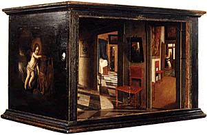 Cadeirinha de Gravensande de 1711 (à esquerda) foi ilustrado por Gravensande em seu ensaio "Um Ensaio sobre Perspectiva '. Ela consistia de um compartimento de estar onde o artista gostaria de chamar a partir da imagem projetada para baixo do telhado de abertura / espelho. O espelho pode ser girado para permitir vistas panorâmicas. Aparentemente, houve algum tipo de pedalar com o pé que permitiu ar fresco para ser bombeado para dentro do compartimento e um tubo em forma de periscópio para o mesmo.